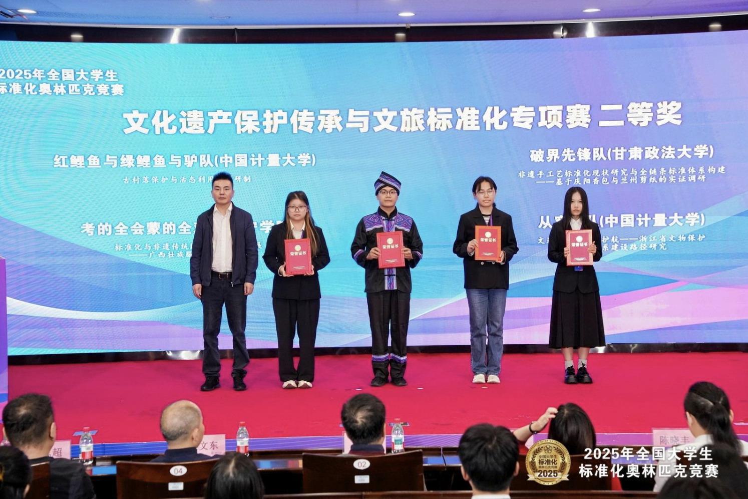 本次競賽由陳嘉鑫、蘇紫敏老師指導的隊伍,針對壯族非遺服飾及其技藝傳承流程規范等痛點,提出了一套可量化的標準化解決方案。由陳嘉鑫、張倩勉老師指導的隊伍則瞄準數字要素與AI標準化前沿,圍繞制造業QMS數據標注與交換規范等議題,構建了相關標準體系框架。